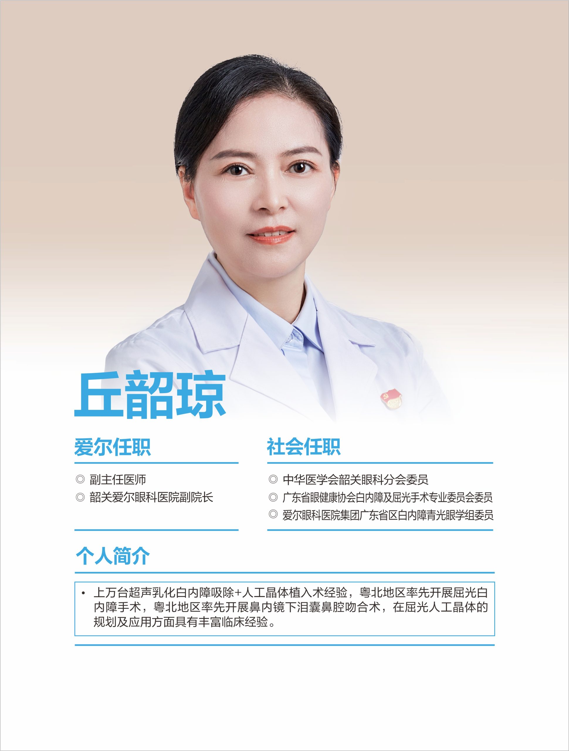 韶關愛爾眼科醫(yī)院有限公司白內障團隊擁王愛琴院長(愛爾眼科粵北區(qū))、丘韶瓊院長、郭俊豪主任等多位專科醫(yī)生,具備同步國際的白內障手術能力,能熟練開展各項常規(guī)及疑難白內障手術。 可開展微切口煥晶白內障手術,植入多焦晶體或多焦+散光矯正晶體,在治療白內障同時同步解決遠視/近視、老花眼、角膜散光等屈光問題,醫(yī)生手術經(jīng)驗豐富,為眾多患者帶來更舒適的視覺。